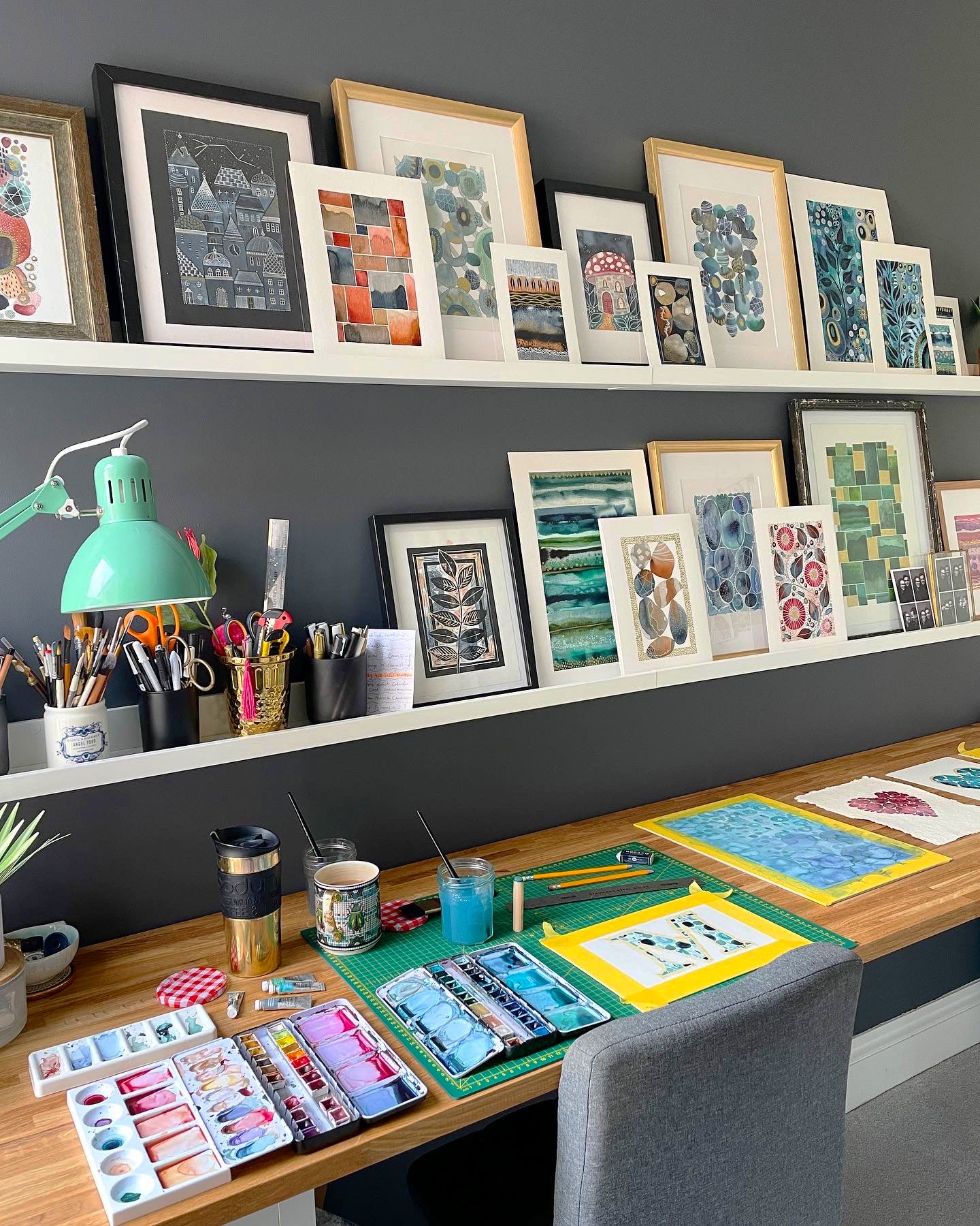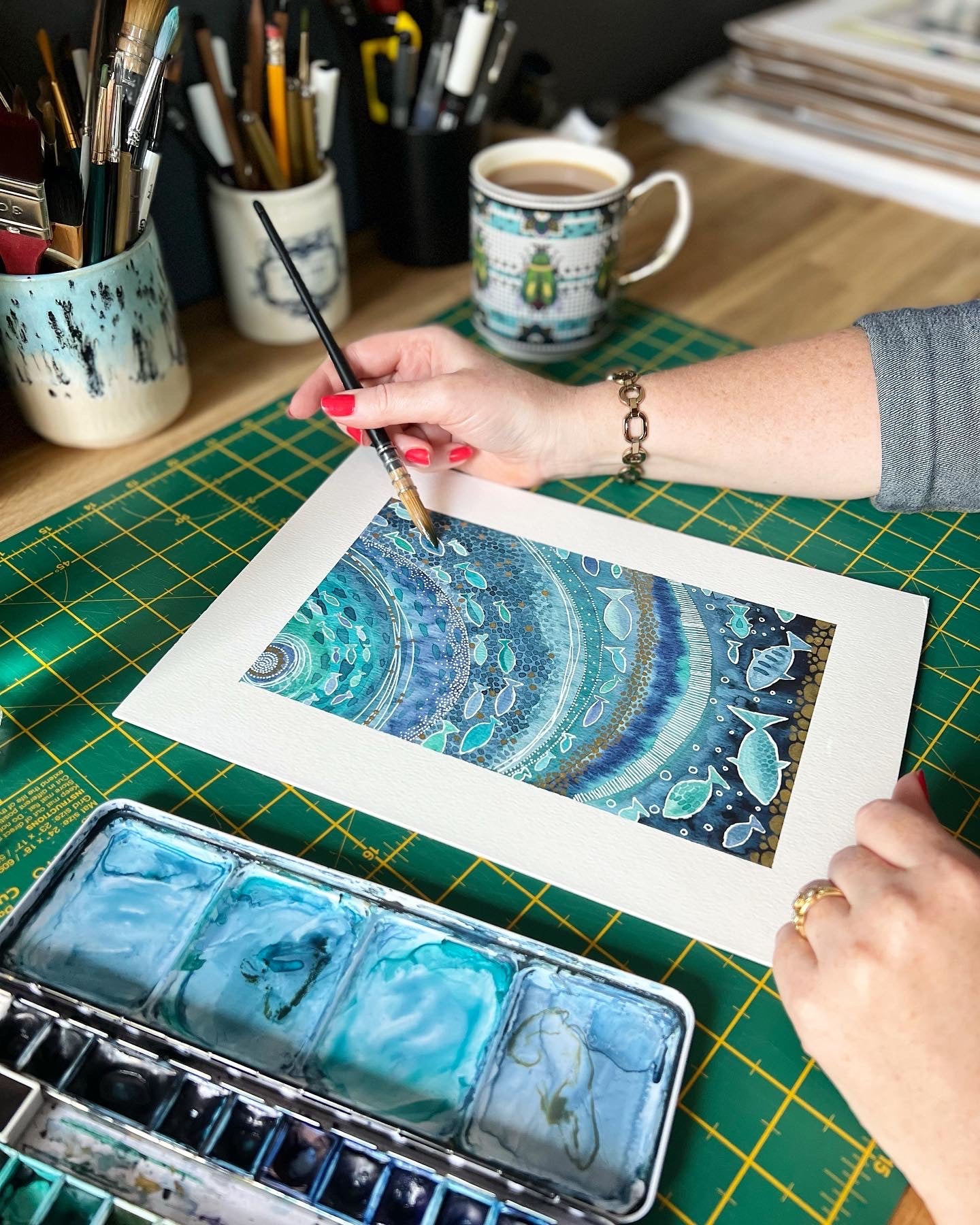 I’m at my happiest while painting in my home studio, listening to an audiobook and occasionally dipping my paintbrush absentmindedly into my cup of (builders) tea!